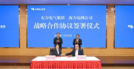 11月20日,中国东方电气集团有限公司与中国南方电网有限责任公司在广州签署战略合作协议。东方电气集团党组书记、董事长罗乾宜,南方电网公司党组书记、董事长孟振平,共同见证协议签署。集团公司党组成员、总会计师吕双与南方电网公司党组成员、副总经理吴小辰代表双方签订协议。